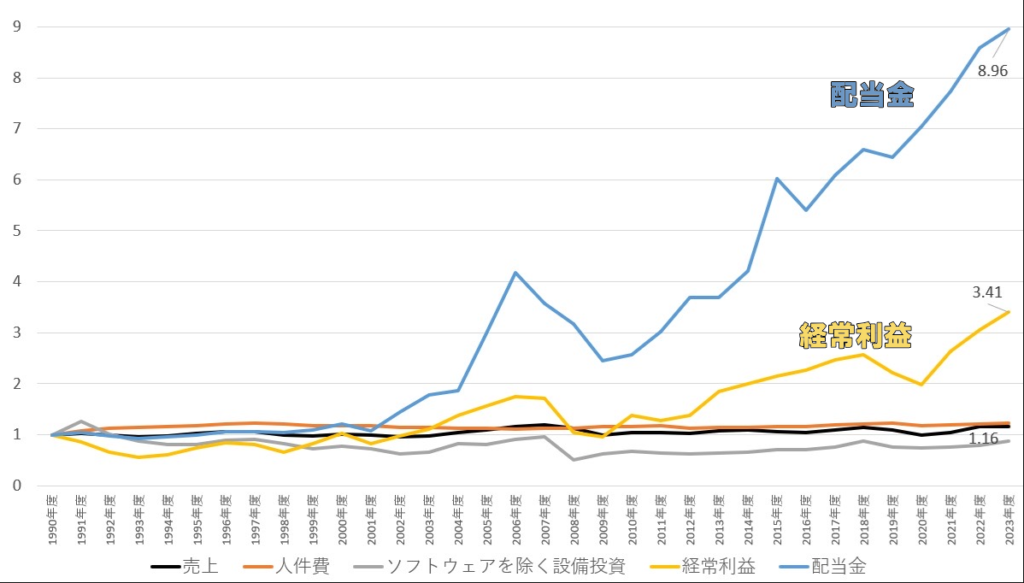 だから、(株主に支払われる)配当金だけが 8.96倍にまで急上昇したわけですよ。